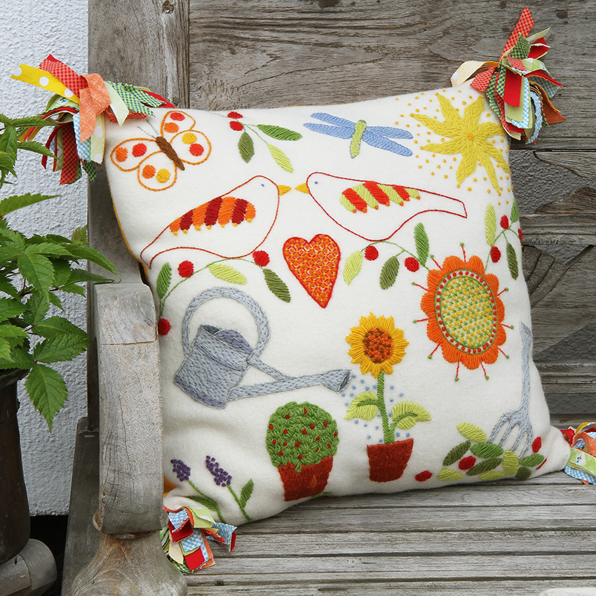 Den är broderad i många roliga stygn och det är en fröjd att brodera det ena motivet efter det andra och låta det växa fram allt efter som. Om du inte vill göra en kudde kan det bli en fin tavla att rama in och hänga upp på väggen. Ögongodis är viktigt i ett hem!